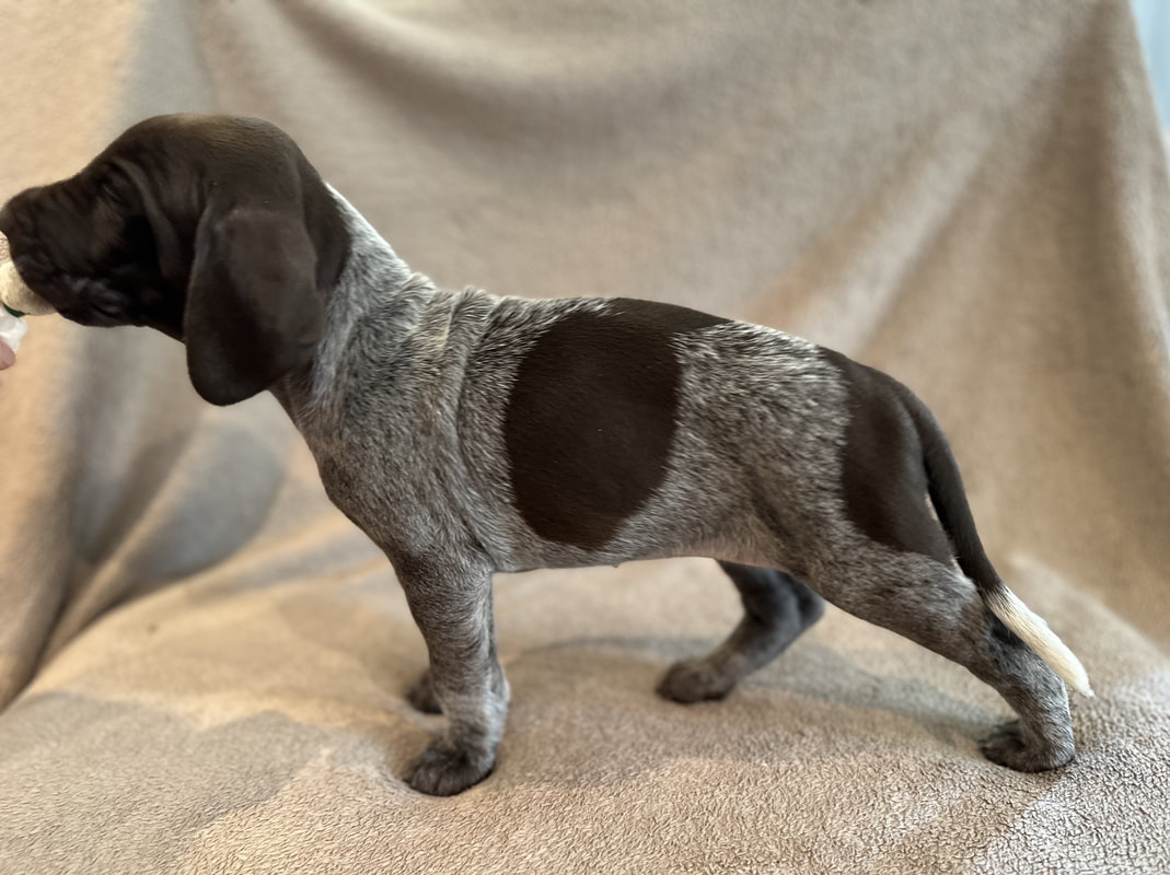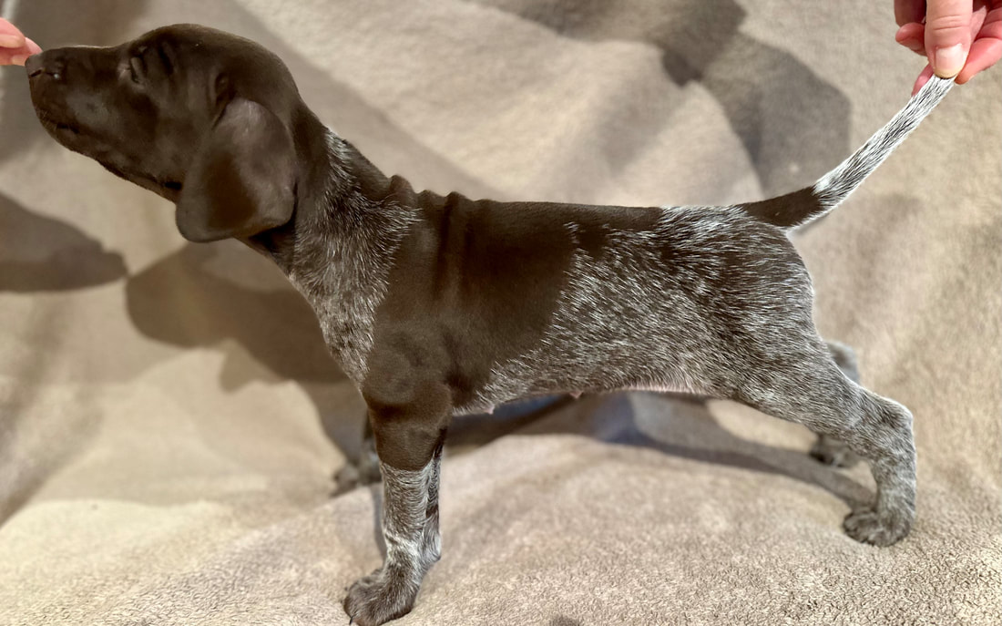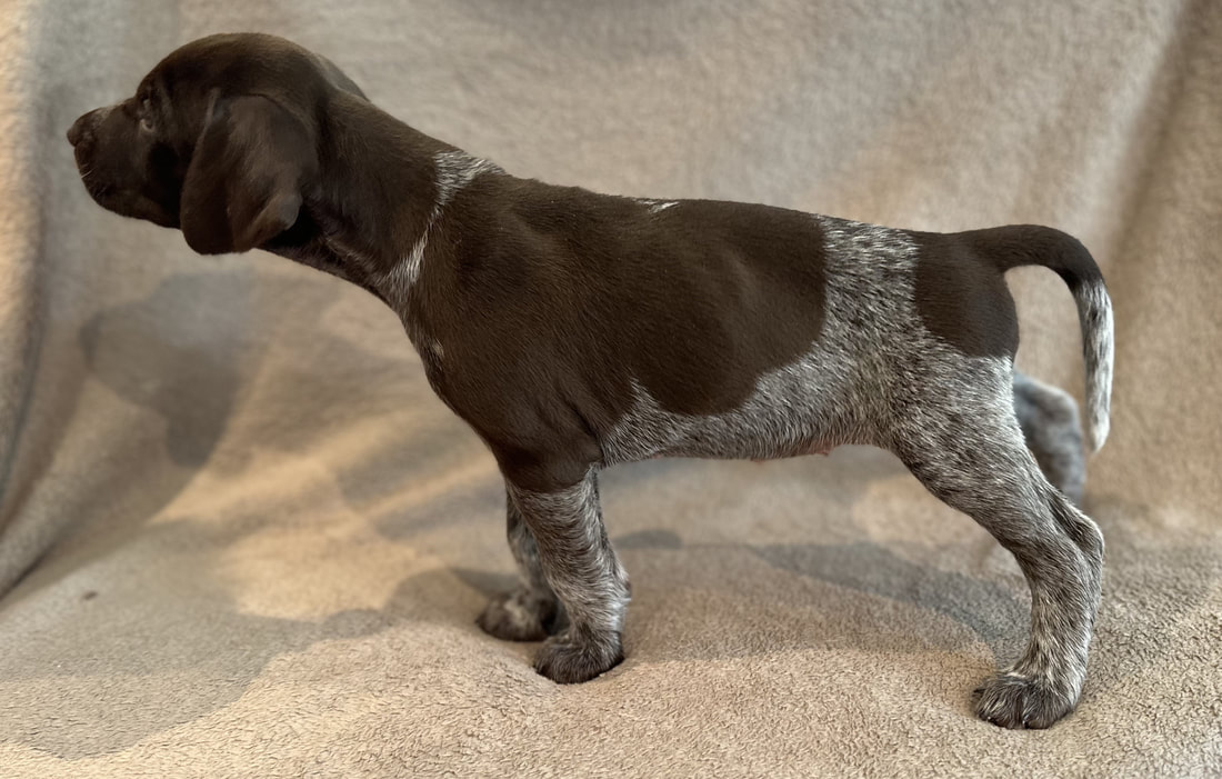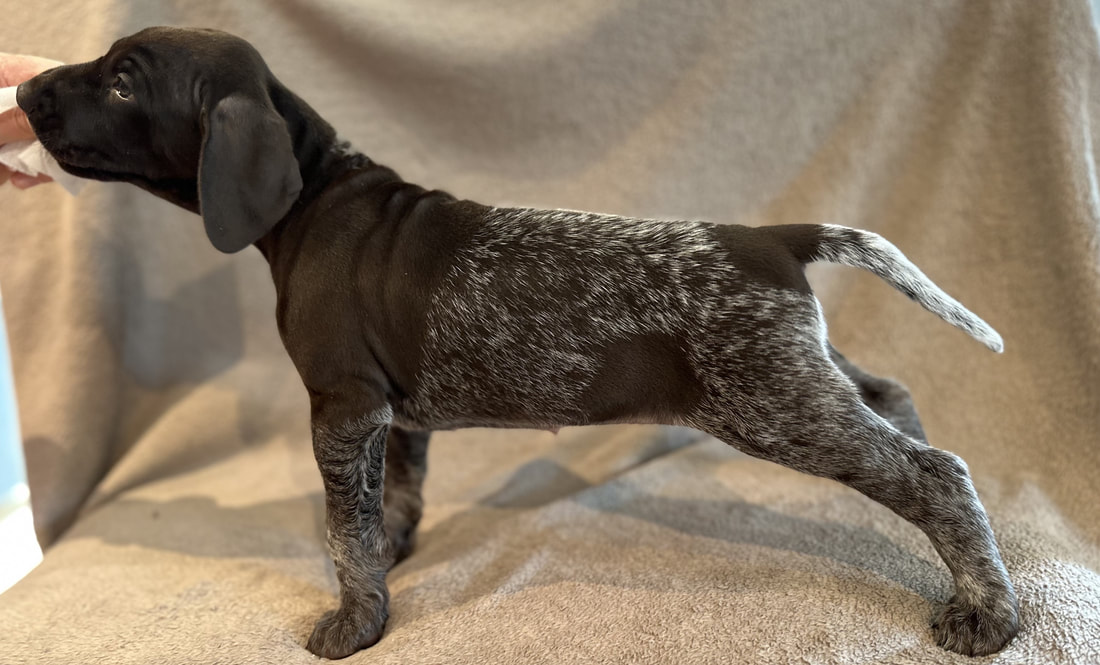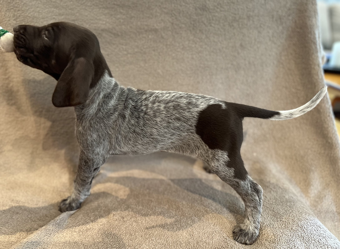 Her er det bilder av valpene da de var fem uke gamle. Bildene er tatt 6. juli 2024. De er satt opp de tre hannhundene først og betegnelsene som er brukt er H for hannhund og T for tispe og tallene for hvilket nummer i rekken de ble født.